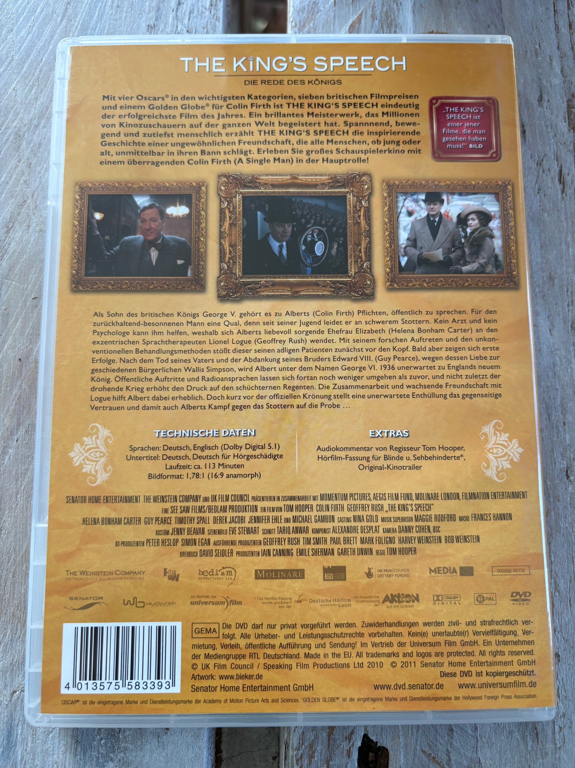 Der britische Königssohn Bertie (Colin Firth) hat ein gewaltiges Problem: Er stottert so heftig, dass jeder standesgemäße Auftritt zur totalen Blamage für sich und seine royale Sippe wird. Unzählige gescheiterte Lösungsstrategien hat der arme Mann längst jede Hoffnung aufgegeben, seine Sprachbehinderung jemals überwinden zu können. Seine Frau Elizabeth (Helena Bonham Carter) überredet ihn zu einem letzten Anlauf – und schleppt ihn in die Praxis des schrägen Sprachtherapeuten Lionel Logue (Geoffrey Rush). Erst ist Bertie abgeschreckt von Lionels ruppigem Tonfall. Doch schon kurz darauf entwickelt sich eine vorsichtige Freundschaft zwischen den ungleichen Männern und der geplagte Adelsmann erzielt erste Erfolge. Dann überschlagen sich die Ereignisse. George V. stirbt, sein Bruder Edward VIII. (Guy Pearce) entzieht sich der Verantwortung als Thronfolger – und plötzlich wird Bertie zum König gekrönt. Wie aber soll ein stotternder König England in den inzwischen unvermeidlichen Krieg gegen Nazi-Deutschland schicken?